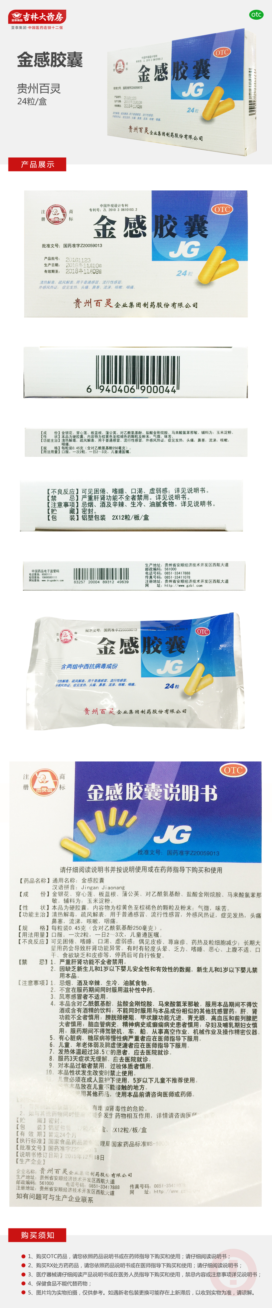 贵州百灵 金感胶囊 24粒 发热头痛 咽喉痛 鼻塞 流涕 咳嗽 感冒发烧